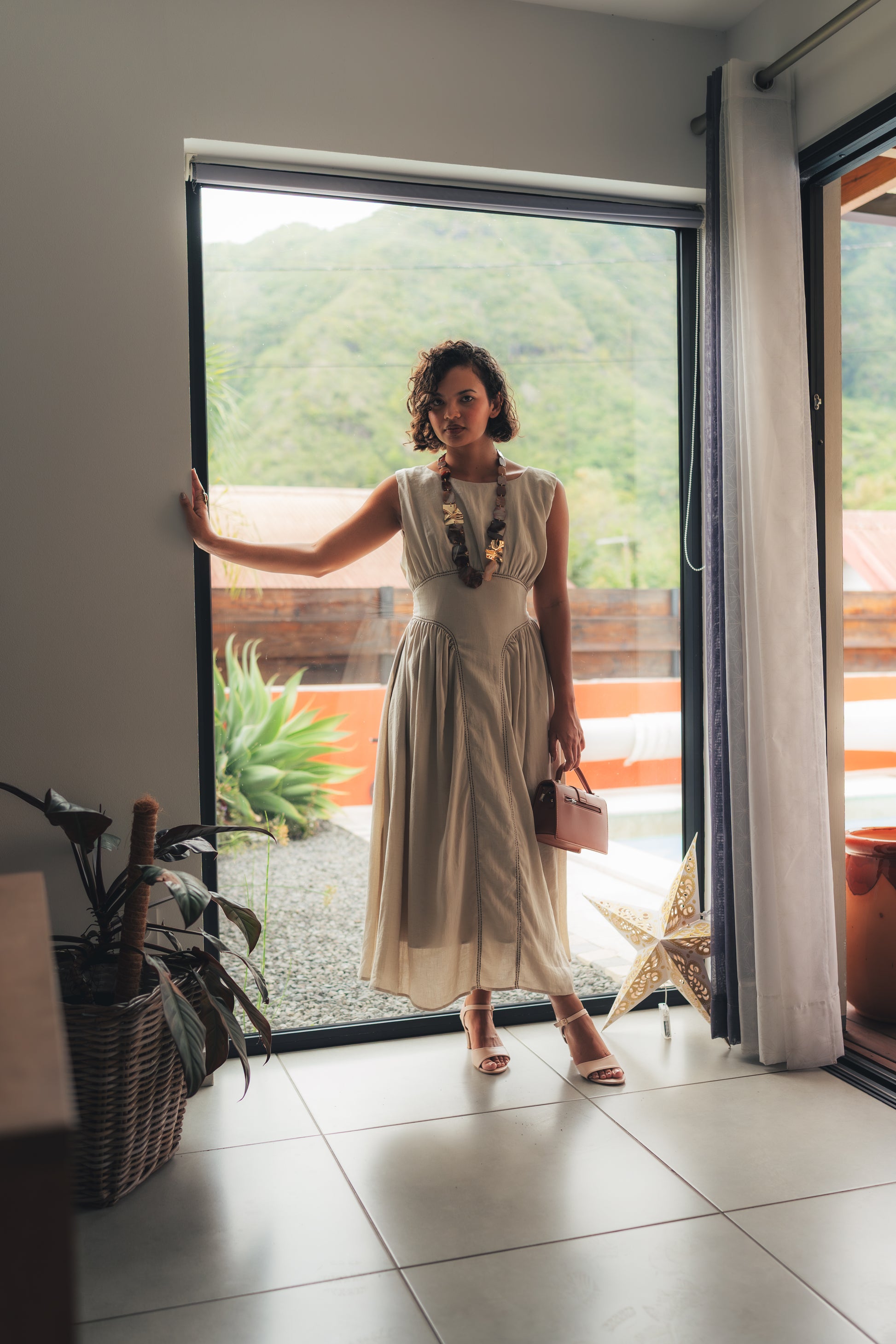 "Confectionnée avec un mélange de 40% de coton, 40% de polyester et 20% de fibres diverses, cette robe longue à manches courtes offre un confort optimal tout en gardant sa forme d'origine. Idéale pour toute occasion avec un style intemporel."